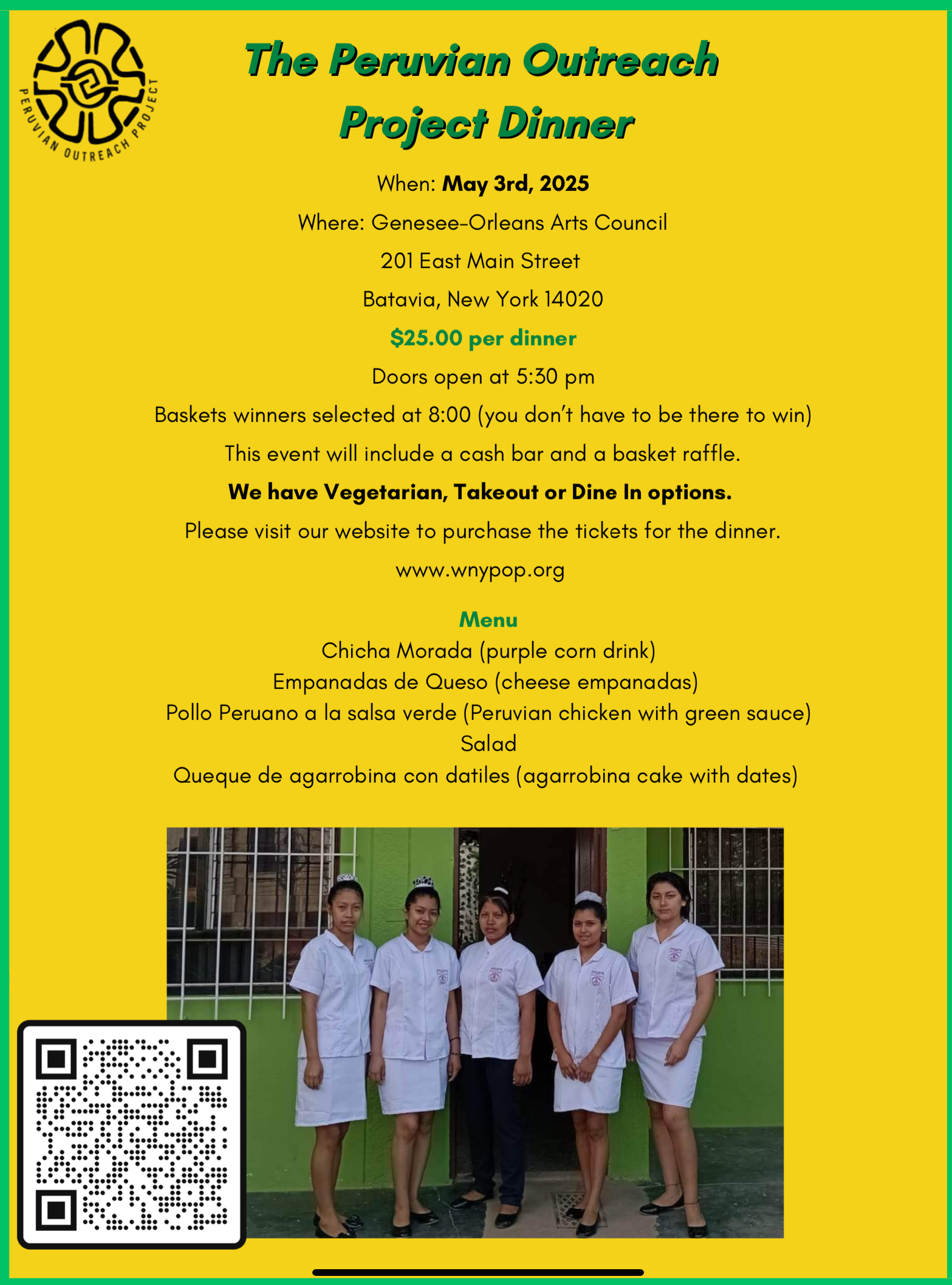 The Peruvian Outreach Project Dinner will be held on Saturday May 3, 2025 at the Genesee-Orleans Arts Council, 201 East Main Street, Batavia, NY. Doors open at 5:30 pm for dinner. There will also be a cash bar and a basket raffle. Tickets are $25 each, can be purchased on POP website https://www.wnypop.org/peruviandinner